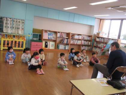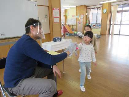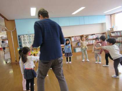 英語教室(たんぽぽ組) 公開日 2021/01/14 更新日 2021/01/14 1日の生活 1月14日(木) 今日から新しい友達が加わり、名前を教えてもらったり好きな遊びを聞いたりしました。雪のために登園できない子もいましたが、ダン先生と一緒に踊りながら英語の歌を歌って楽しみました。最後にカバのヒッポちゃんとお別れの握手をして、元気にさようならの挨拶をした子供たちでした。
