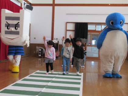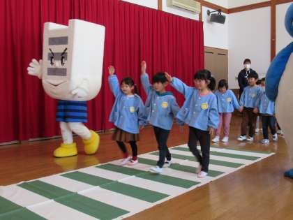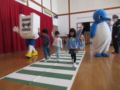 アミーちゃんとわたるくんと一緒に教わった渡り方で横断歩道を渡りました。