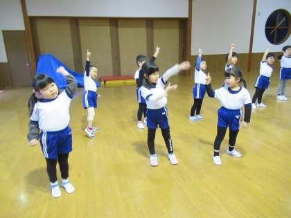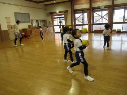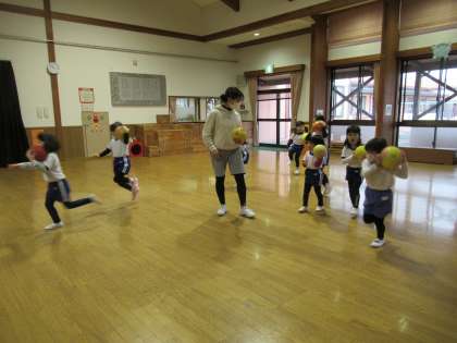 体操教室(たんぽぽ組) 公開日 2021/01/27 更新日 2021/01/27 1日の生活 1月27日(水) 今日の体操教室はボール。ボールを手に持って落とさないように走ったりスキップしたりして楽しみました。最後は、上にボールを投げてキャッチできるかに挑戦。高くは投げられなくてもキャッチできると大喜びしていました。