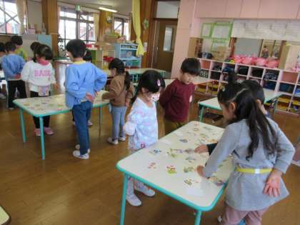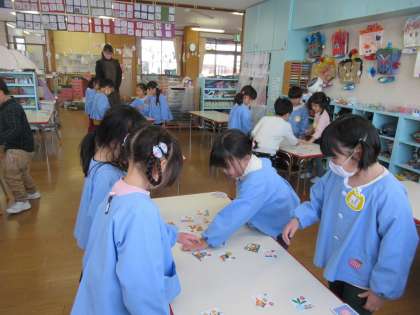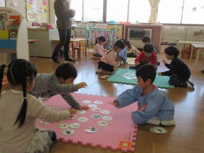 カルタ大会 公開日 2021/01/29 更新日 2021/01/29 1日の生活 1月29日(金) 1月に入り、カルタやコマ回し、羽子板といったお正月遊びを楽しんできました。今日は各年齢に分かれて、カルタ大会をを行いました。どの子も真剣な眼差しで「はい」と大きな声で返事をして、札を取っていました。
