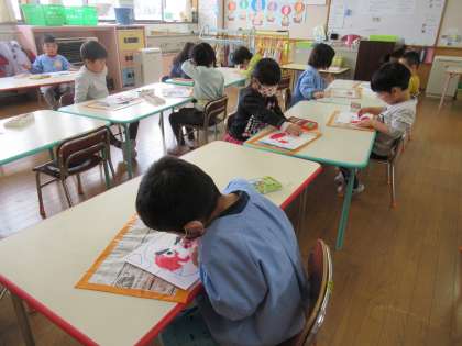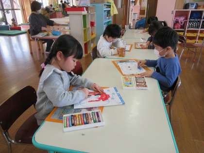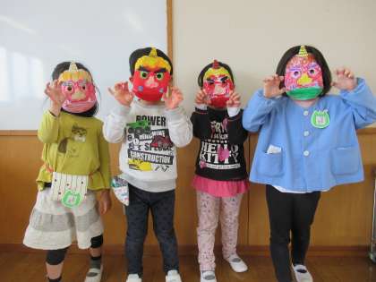 鬼のお面づくり 公開日 2021/02/01 更新日 2021/02/01 1日の生活 2月1日(月) 今日は月刊誌の付録についていた鬼のお面をつくりました。クレヨンで色を塗り、のりで角を貼ったらできあがりです。それぞれに好きな色を塗り、仕上げました。お面をかぶったまま年少組に行き、新聞紙でつくった豆を投げられながら「ガオ〜!」と鬼になりきっていました。