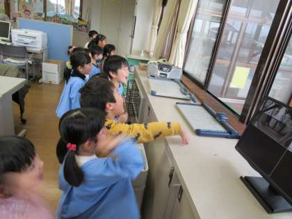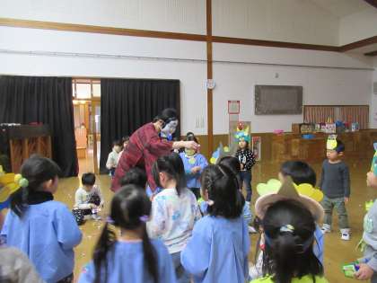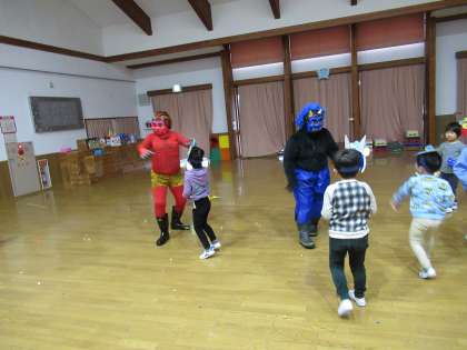 どこからともなく太鼓の音が聞こえたかと思うと、赤鬼と青鬼の登場。やっつけようと一生懸命に「鬼は外!福は内!」と声をかけながら、豆を投げていました。鬼が痛がって逃げていった後に福の神様が春を運んできてくださいました。年長さんが、各部屋もかけ声をかけながら回ってくれ、玄関に柊とイワシも飾ったので、もう鬼は来ないでしょう。