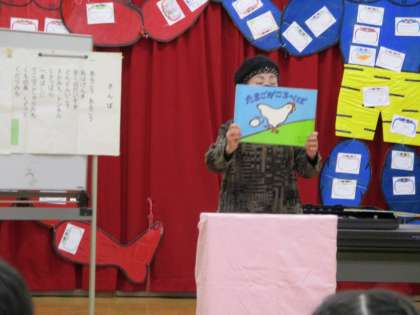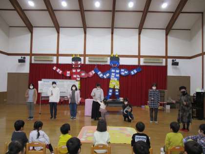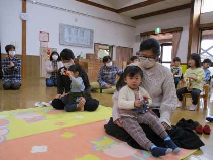 親子サークル 公開日 2021/02/02 更新日 2021/02/02 1日の生活 2月2日(火) 今日の親子サークルは、渋谷明美先生を迎えて歌やピアノ、紙芝居、パネルシアター等を楽しみました。みんなが大好きな「トトロ」「さんぽ」「ドラえもん」をピアノの演奏に合わせて歌ったり、「おもちゃのチャチャチャ」の曲に合わせて、すず、カスタネット、タンバリンを鳴らしたりしました。サークルのお母さんも参加してトーンチャイムできらきら星の演奏もして、素敵な時間を過ごしました。