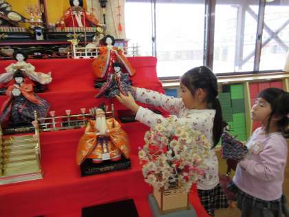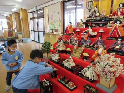 今日はみんなでお雛様を飾りました。ひな人形をそっと運び、台の上に乗せたり「これ何だろう」と道具をじっと見たりしていました。飾り終え、お雛様を見ながら「この人かっこいい」「僕はこの人がかっこいいと思う」という話になり、みんなでお雛様の歌を歌ったり、ひな人形の名前を思い出したりしました。お家のひな人形を飾るのも楽しみにしている子供たちでした。