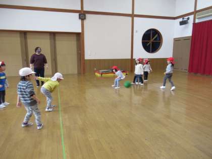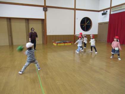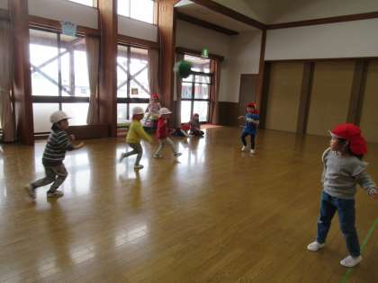 ドッジボールをしました(たんぽぽ組) 公開日 2021/02/03 更新日 2021/02/03 1日の生活 2月3日(水) 今まで転がしドッジボールはしてきましたが、初めて投げるドッジボールをしました。たんぽぽ組の部屋でルールや約束事を話し合い、プレイルームに移動。今回は、男の子対女の子でしました。上から投げることは難しいのですが、それなりに形になり、かっこよく投げていましたよ。今日は2対2の引き分け。「また、明日もしたい」「毎日したら、投げるの上手になりそうだね」と話していました。
