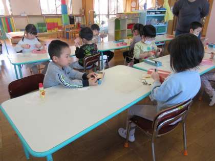 朝一番にお雛様づくりの続きをしました。今日は顔と髪の毛をハサミで切ってのりで貼り、仕上げました。来週は、お雛様の杓や扇、冠などをつくろうと思っています。