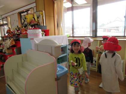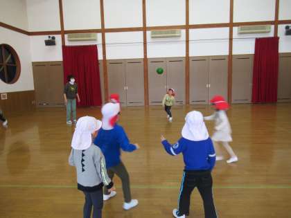 今日は遠足の予定でしたが、年中組はお留守番になり、その代わりにお楽しみ会として、ドッジボールと宝探しをしました。昨日とはルールも変わり、外野から内野の友達にボールが当たったら戻れることになりました。だんだんとボールをよける動きも機敏になってきました。部屋に戻ってから宝探しをすると、くまなく探し回り、見付かると「やった!」と喜んでいました。見付けたお菓子は、お弁当の後のデザートとして食べました。