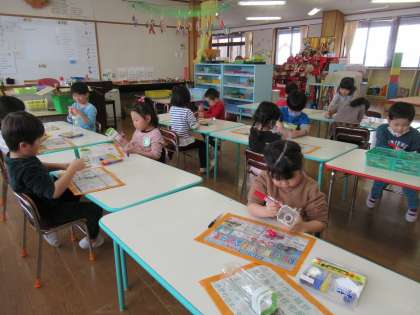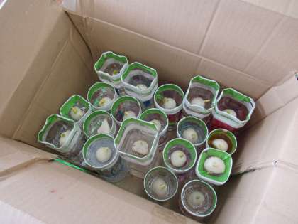 そして、チューリップの水耕栽培をしようと、球根に冬の寒さを経験してもらうために冷蔵庫に入れて2か月。冷蔵庫から出す日が来ました。一人一人、ペットボトルでつくった容器に模様を描き、球根の皮をむいて、そっと容器に入れました。ここから1か月間、冷暗所に置き、部屋の暖かいところに出すと「春が来た」と思い、花が咲くそうです。花が咲くまで、楽しみにしている子供たちです。
