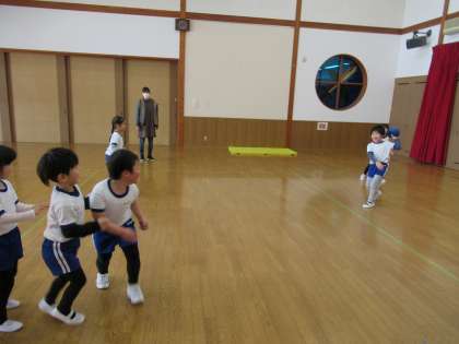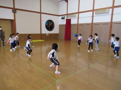 今日は体操教室の後にみんなでドッジボールをしました。チーム決めでは「運動会の赤と白のチームがいい」という意見が多く、赤・白チームで対決しました。外野をチームで相談して決め、積極的にボールに触れたり、近くにいる友達を狙ったりしてとても楽しんでいましたよ。2回白チームが勝ったところでチームを変え、最後は女子対男子で挑戦。10対5でしたが、男子チームの勝ちとなり、悔しそうな女の子チームでした。次はどうなるのか、楽しみです。