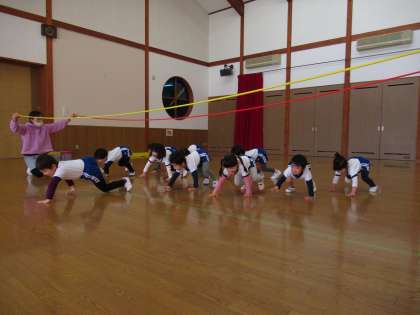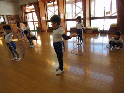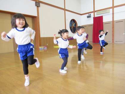 体操教室がありました(ほし組) 公開日 2021/02/09 更新日 2021/02/09 1日の生活 2月9日(火) 今日は体操教室がありました。新しい踊りや縄跳びをしました。長縄ではウサギやカエルになって縄を跳んだり、ワニになってくぐったりしました。自分の縄をもち、回してジャンプを繰り返ししたり、縄を回しながら歩いたり、走ったりもしました。長縄や前跳びのジャンプの時に両足が揃っている子が増えてきましたよ。これからも楽しく縄跳びをして遊んでいきたいと思います。