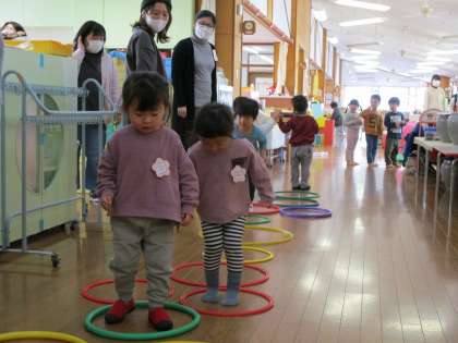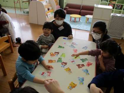 親子サークル 公開日 2021/02/09 更新日 2021/02/09 1日の生活 2月9日(火) 今日の親子サークルは、2月・3月生まれの誕生会をしました。そしてその後は、動物のカードを使って遊んだり、フープをジャンプしたりして遊びました。