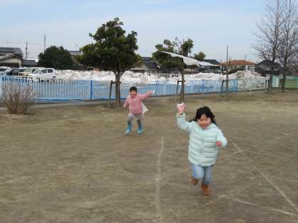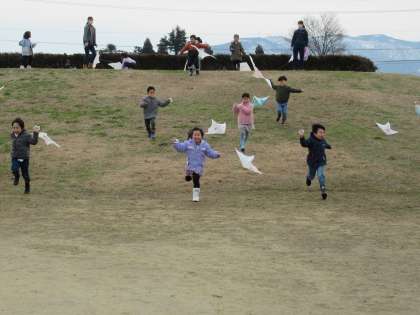 今日は天気が良かったので、みんなでピーターパン広場で凧揚げをしました。前回は風が強く、すぐに凧が揚がりましたが、今日は少し走らないと凧が揚がらず、手を伸ばして走ったり、山の上から降りてきたりして凧を揚げました。すぐに落下してしまう凧もいれば、気持ちよさそうに揺れている凧もいて、とても楽しそうな子供たちでした。少し慣れてくると、走らずに風に乗せて揚げることに挑戦する姿も見られました。