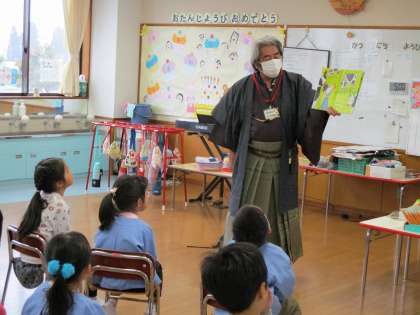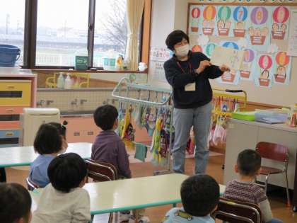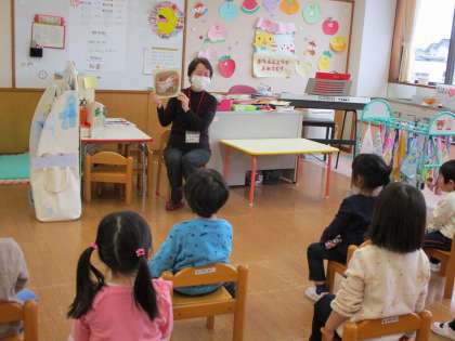 おはなしの会がありました 公開日 2021/02/15 更新日 2021/02/15 1日の生活 2月15日(月) 今日は、大久保地区社会福祉協議会の方が来られて、絵本を読んでくださいました。季節や年齢に合わせた絵本を選んで持ってこられ、いつも楽しく見せてもらっています。優しい語りが子供たちの心に残り、情緒豊かな子に育ってくれると思います。