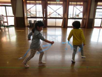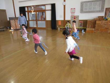 今日はしっぽ取りをして遊びました。しっぽを付けると嬉しそうに後ろを振り返ったり、走ってみたりする子供たち。初めは逃げることや友達のしっぽを追いかけることに必死で、気付けばみんな1列になって走っていました。しっぽが取られないように気を付けようとしている子もいて少しずつ上手になっています。