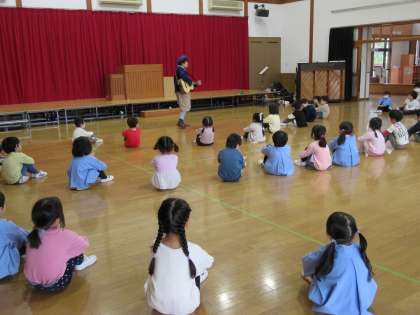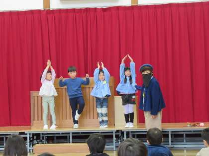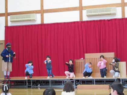 お楽しみ会がありました 公開日 2021/03/05 更新日 2021/03/05 1日の生活 3月5日(金) 今日はお楽しみ会がありました。酒井幸美先生の楽しい歌を聴いた後は、みんなで忍者になって修行をしました。木や石、犬に変身する修行や、手裏剣を投げる修行、最後は全集中の修行をしました。とても上手にできたので、4月には素敵なお兄さん、お姉さんになれるねと言ってもらい、嬉しそうな子供たちでした。
