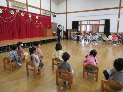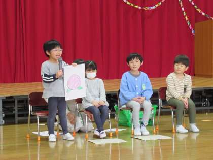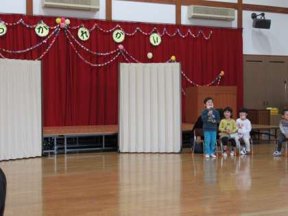 お別れ会 その1 公開日 2021/03/10 更新日 2021/03/10 1日の生活 3月10日(水) 今日はつばめ組さんとのお別れ会がありました。たんぽぽ組はつばめ組さんが喜んでくれるレクリエーションを企画して、今日まで準備をしてきました。○×クイズでは、先生の好きな食べ物やおもちゃを当てたり、つい立ての間を通った物が何かを当てる投げっこゲームをしました。どんどんクイズが難しくなり、子供たちは熱心に答えていました。