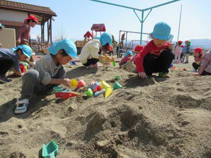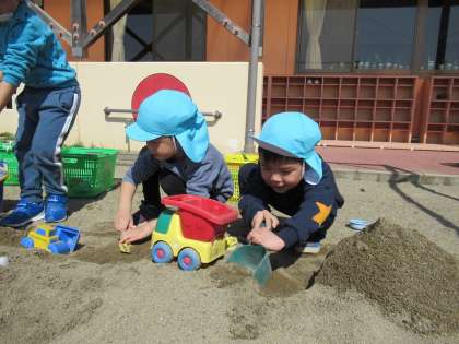 今日も天気がいいので外で遊びました。砂遊びで料理を先生や友達につくったり、今日はたんぽぽ組の友達も一緒に隠れ鬼ごっこをしました。「次は先生が鬼ね」「次は僕」と言って楽しく遊びました。また飛行機雲を見付けた子もいました。今日も元気いっぱいなほし組でした。