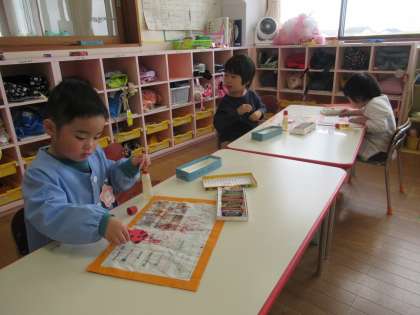 4月に向けて、保育室を春でいっぱいにしようと、今日はまずてんとうむしからつくりました。それぞれのパーツをのりで貼って組み合わせ、顔や模様を描きました。模様の描き方もさまざまで、数や大きさにこだわっていました。あっという間にかわいいてんとうむしができあがりました。