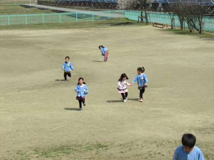 幼稚園で遊ぶのも今日で最後の日となりました。修了式の歌や言葉の確認をした後は、ピーターパン広場で遊びました。気持ちの良いお天気の中、花いちもんめや、鬼ごっこなど、先生や友達とたくさん遊びました。