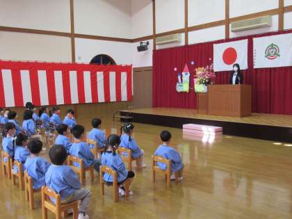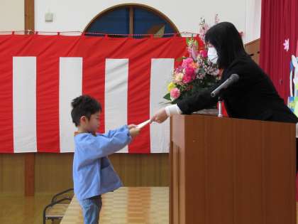 3・4歳児の修了式がありました 公開日 2021/03/24 更新日 2021/03/24 1日の生活 3月24日(水) 今日は3・4歳児の修了式がありました。名前を呼ばれると元気に返事をし、園長先生から修了証書をいただきました。先日のつばめ組の姿を思い出し、大きな声で「ありがとうございます」と言うことができました。先生や友達と楽しく遊び、たくさん成長できた1年になりましたね。 4月からはつばめ組とたんぽぽ組に進級します。元気に幼稚園に来てください。待っています。