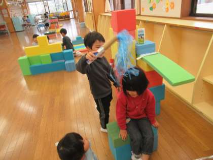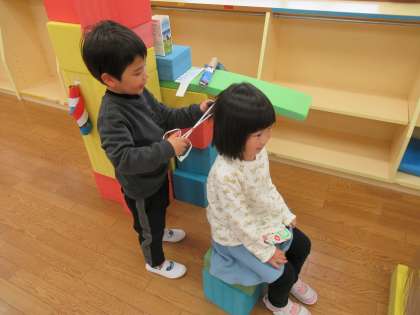 先日からカラー積み木で床屋さんの遊びをしていた子供たち。今日はシャワーをつくったことがきっかけとなり、鏡やクシ、ハサミなど、必要なものをつくってお客さんを招いたり、お客さんになったりして遊びました。ほし組の友達も興味を示して何人か遊びに来てくれ、嬉しそうな子供たちでした。