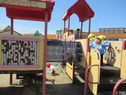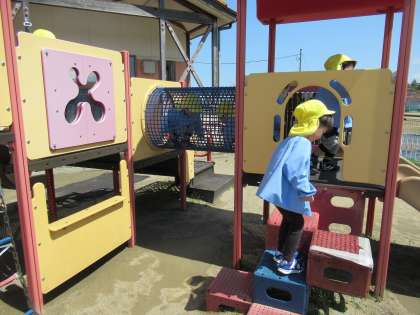 今日はなかよし広場で遊びました。初めて見る滑り台や鉄棒に興味津々の子供たち。ハンドルを握って運転したり、滑り台の上から先生に向かって「ヤッホー!」と声をかけたりしました。初めての戸外遊びにで嬉しそうな子供たちでした。