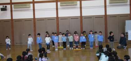 年長組になって初めての交流保育をしました。お互いの先生や友達の自己紹介をしたり、入所式、入園式で披露した踊りや歌を見せ合ったりしました。保育所の踊りを興味深そうにみていたつばめ組さんです。