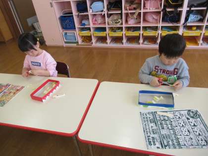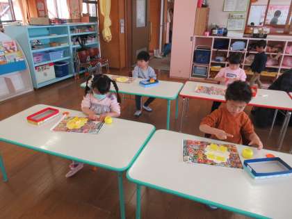 今日は菜の花の製作をしました。4分の1に折った折り紙の切り線に合わせてハサミで切り、菜の花の土台にのりで花を貼りました。曲線を切るのは少し難しかったですが、折り紙を持つ手の位置やハサミの使い方を確認しながら行い、かわいい菜の花ができましたよ。今日の製作は5月の玄関に飾る予定です。