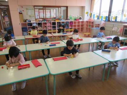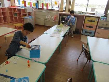 クラスではこいのぼり製作の続きをしました。お花紙を使い、とてもかわいいお母さんこいのぼりができましたよ。