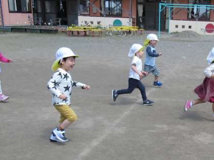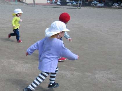 今日はなかよし広場でかけっこをしました。先生を追いかけたり、先生のところまで友達と一緒に競争したりしました。気持ちが良い風が吹く中で何度も嬉しそうに走っていた子供たちでした。