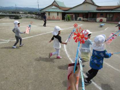 こいのぼり(ほし組) 公開日 2021/04/27 更新日 2021/04/27 1日の生活 4月27日(火) 今日は自分でつくったこいのぼりを持ち、園庭に出て泳がせました。息を吹くと風車が回ることに気付いて大喜びの子供たち。風が吹くとより回転し、走ったり、こいのぼりを上にあげてみたりして、どうしたらたくさん回るかいろいろとやってみました。大きなこいのぼりを見付けて自分のこいのぼりと見比べている子もいましたよ。