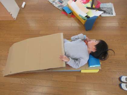 空き箱や段ボールで恐竜やキラメイジンなど、つくって遊ぶことができるようになってきた子供たちは、空き箱入れから色々と材料を集め、組み合わせてつくることが楽しくなってきたようです。今日は掃除機をつくった子を見て、次々と掃除機づくりが広がりました。また、「眠たくなった」という子は自分でベッドをつくり、大好きなこいのぼりと一緒に横になることを楽しんでいましたよ。