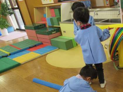 今日はオープンスペースでジャンプ台やトンネルの他に、新しい遊具を加えて遊びました。自分で場所を決めて置いたり、友達と協力して運んだりして出来上がると嬉しそうに繰り返し遊んでいました。たんぽぽ組やつばめ組のアスレチックにも挑戦している子もいました。いろいろなことができるようになって嬉しそうな子供たちでした。