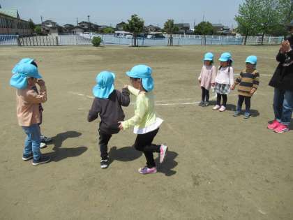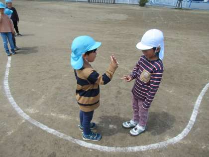 今日はピーターパン広場で遊びました。最初にかけっこをし、「位置について」の構え方や「よーい」で手を変えることが少し分かるようになりました。その後に「ドン・じゃんけん」をしました。少しずつルールがわかるようになると、大きな声で「負けたー!」と言うことができるようになってきました。次の番の人がすぐに走り出すことはまだ難しいようですが、繰り返し遊んでいきたいと思います。そして「はないちもんめ」にも挑戦しました。ルールはすぐに覚え、相談するのも楽しそうでした。ケンケンをして回るのがまだ上手くできない様子がとても可愛かったです。