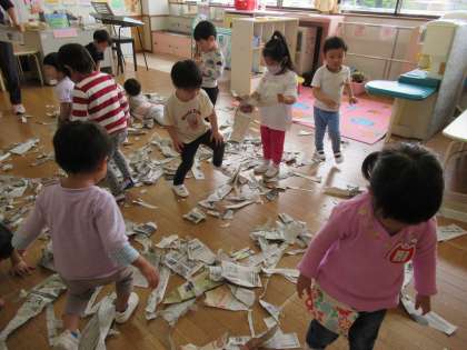 午後は新聞紙を使って遊びました。ビリビリと破いて小さくたり、細長くしたりして新聞の感触や音を楽しんでニコニコの子供たち。破いた新聞紙を集めて上に投げたり、友達や先生にかけてみたりしてたっぷり遊びました。最後には大きなビニール袋に入れていたのですが・・・途中で袋の中から新聞紙を出す子がいてもう一度やり直しに。しかし、それも面白くてみんなで大笑いしながらもう一度集めました。大きな何かができると「おもちだ!」と言う子がいました。「おもち」を使って遊んでいるといつの間にか爆弾へと変身し5秒以内に友達に回さないと爆発すると、みんなで大慌てで回して遊びました。みんなから大人気だった新聞紙遊び。また遊びたいねと話していました。