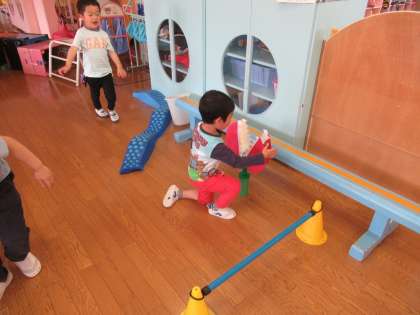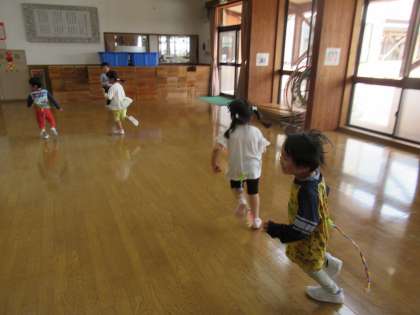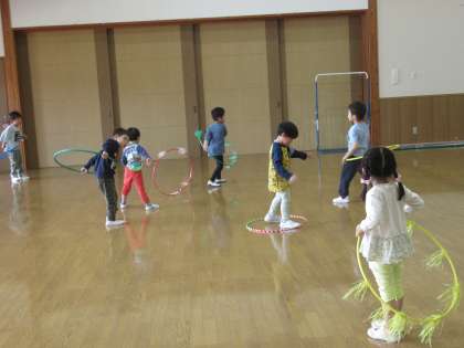 今日はみんなでしっぽ取りゲームやフラフープをして遊びました。しっぽ取りは子供たちが逃げ、先生が追いかけました。「もう1回やろう」と何度も喜ぶ子供たちでしたが、追いかける方がクタクタになってしまいました。フラフープ遊びは、フープで縄跳びをしたり、床の上でくるくる回したり、手首や腰で回したりしてみました。手首や腰で回すのは難しくて何度も挑戦していましたよ。
