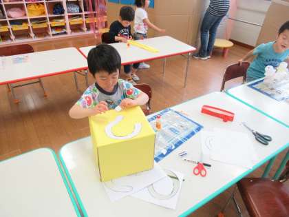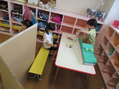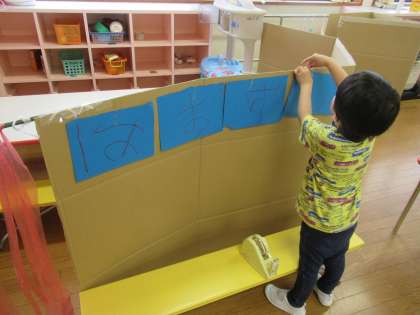 クラスではお寿司屋さんに看板がつき、先週からつくっていたお寿司を運ぶはやぶさが完成し、早速お客さんが食べに来ていました。マリオのはてなブロックもつくり、ジャンプして頭でブロックを押していました。「浮かせたい」とのことですが、どこにどうやって浮かせたら良いのか、またみんなで相談していきたいと思います。