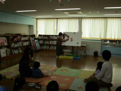 今日の親子サークルは、講師に吉野絵美先生をお迎えして、楽しいパネルシアターを見ました。「赤いりんご」「パン屋に5つのメロンパン」「はたらくくるま」「イグアナレストラン」のお話しがあり、音楽や歌に合わせて一緒に歌ったり体を動かしたりして楽しい時間を過ごしました。
