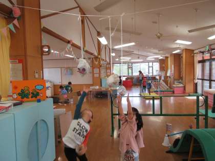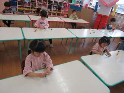 今日は昨日つくっていたカエル製作の続きをしました。昨日は顔と体をつくり、今日は手と足をつくりました。細い画用紙で紙バネをつくるのは初めてでしたが、できると「びよーん」と伸ばしてみたり「どこにつけようかな」と手足を自分の好きな場所に張り付けていました。