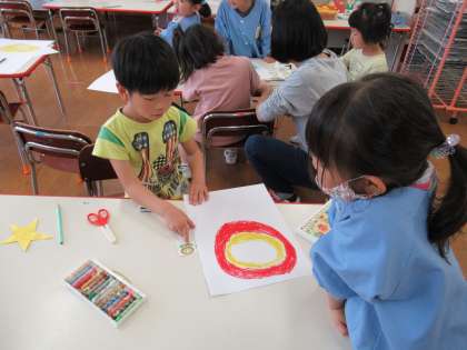 「マリオカートの道をつくりたい」ということで道を描きました。「コインやバナナがあるよ」とマリオカートを知っている友達の意見を聞きながら遊びを進めています。