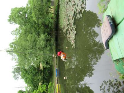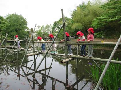 午後からはほし組は散策、たんぽぽ組はいかだ乗り、つばめ組はターザンロープやいかだ乗り、池ジャングルをしました。ターザンロープや池ジャングルでは少し怖がる子もいましたが、やってみると楽しかったようでとても喜んでいましたよ。