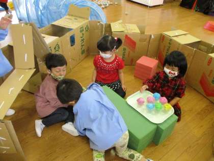 今日は玉入れやザリガニ釣りで遊びました。また、昨日からできたアリさんトンネルが大人気で、いろいろな道に入っては窓から顔を出したり、トンネルの中で少し休憩したりしている子もいました。昨日トンネルの真ん中に「ジュースやアイスがあると良い」という声があり今日はジュース屋さん、アイス屋さんになって遊びました。「いらっしゃいませ」「何味にしますか」「お金はいりませんよ」「いや3000円です」「ありがとうございました」とお客さんとやり取りしたり、先生や友達と一緒にジュースやアイスを飲んだり食べたりしてとても楽しそうでした。