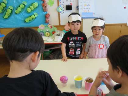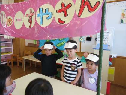 今日はジュース屋さんごっこをして遊びました。店員さんとお客さんになり「いらっしゃいませ」「これください」「どうぞ」「ありがとう」とやり取りをしながら遊びました。好きな遊びをする時間も「早くジュース屋さんで遊ぼう」という声が聞かれ、いざ開店準備が整うと「いらっしゃいませ」と大きな声で声をかけていました。アイスも売られ、楽しそうなお店屋さんが開店しました。