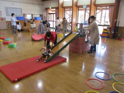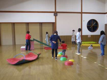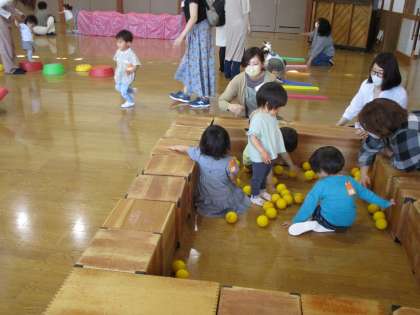 今日の親子サークルは、プレイルームでサーキット遊びをしました。滑り台やスポンジボール、トンネルなど自分の好きな場所へ行ってたくさん遊び、みんなニコニコでした。