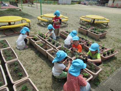 今日は園庭のプランターに花の苗を植えました。最初は力加減が分からなかったり、上手く苗をひっくり返して取り出すことができず、戸惑う姿が見られましたが、段々と手際が良くなり、次々と植えていきました。どんな色の花が咲くのか楽しみにしていましたよ。