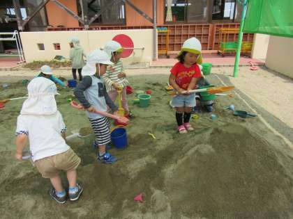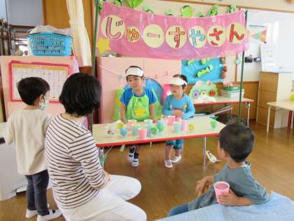 今日のほし組の様子 公開日 2021/06/02 更新日 2021/06/02 1日の生活 6月2日(水) 今日もジュース屋さんをして遊びました。エプロンを付けたことが嬉しかったようで繰り返し遊んでいました。店員さんのように「どれにしますか」とお客さんに聞いてる子もいました。 また、天気が良かったので外の固定遊具で遊んだり、砂遊びを楽しんだりしました。暑くても元気いっぱいの子供たちでした。