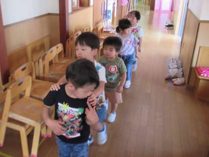 今日は保育所と交流保育がありました。お互いの名前を教え合ったり、先生の名前も教えてもらいました。また、幼稚園や保育所の中を探検して楽しい遊びを紹介しました。少し緊張していた子供たちでしたが、最後にはみんなでエビカニクスを踊り「また遊ぼうね」と約束しました。