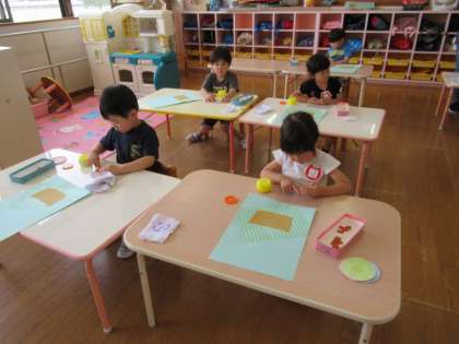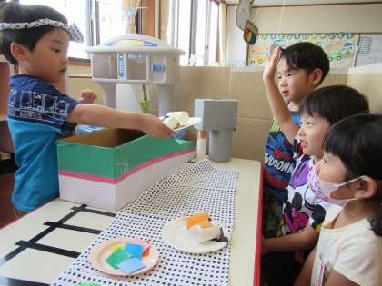 そして、クラスではアイスの製作をしました。昨日白い画用紙に白いクレヨンで描いたアイスが魔法の液で綺麗なアイスに変身しました。今日はのりをつけて、カップに乗せたり、ウエハースやサクランボをトッピングしてかわいくしました。「おいしそうだね」「アイス食べたいね」そんな声も聞かれました。