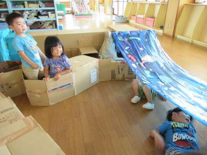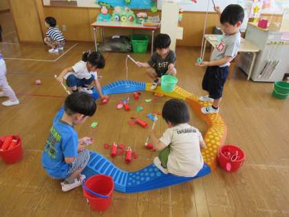 ザリガニ釣りが上手になってきたので、磁石で釣っていたところをフックに変えてみました。少し難しくなりましたが、みんな上手に引っかけて何匹も釣っていました。さらに、たんぽぽ組のマリオお化けサーキットに遊びに行ったり、ほし組の遊びに招待したりしました。楽しい遊びがたくさんあり、とても嬉しそうに遊んでいました。