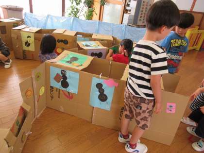 また、アリさんトンネルの食事をするところにアリの大好きなキャンディーやビスケットなどを、みんなでつくってトンネルに貼りました。自分がつくったアリに食べさせてあげたり、お菓子がたくさんあるところを見付けて、たくさん食べたりしました。賑やかで可愛いアリさんトンネルになってきましたよ。